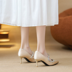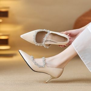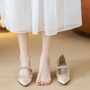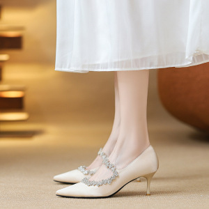 马面裙国风旗袍配的鞋子女夏季浅色细跟优雅水钻高跟鞋尖头2025年