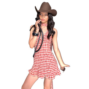 2025 ヨーロッパとアメリカの夏のクロスボーダー新しいレトロホットガール赤いチェック柄スリム気質ディープ V ホルターネックドレス女性のための