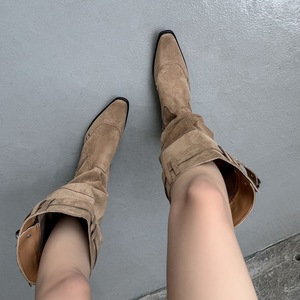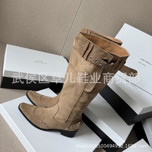 绒面皮带扣堆堆靴女宽筒长靴秋新款方头粗中跟套筒不过膝靴骑士靴