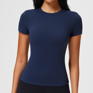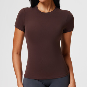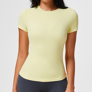 跨境新款纯色t恤短袖女夏修身健身服运动裸感正肩速干瑜伽服上衣