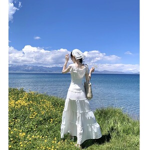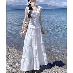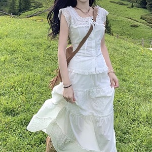 西西里仲夏 法式蕾丝拼接收腰衬衫套装 可甜可盐小清新白色一整套