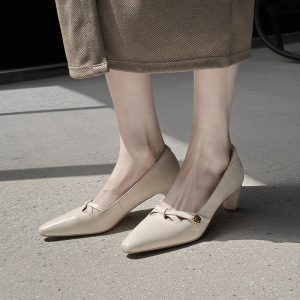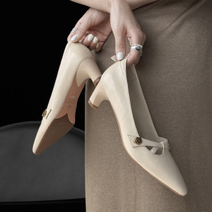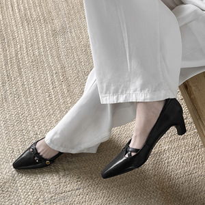 超気質の小さなスクエアトゥカメリアトップレイヤーシープスキンメリージェーン2025秋厚いミディアムヒール本革浅い口の靴女性用