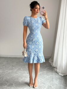ヨーロッパとアメリカの国境を越えた夏の新しいレディースパフスリーブテクスチャージャカードラウンドネックレトロスタイルドレス