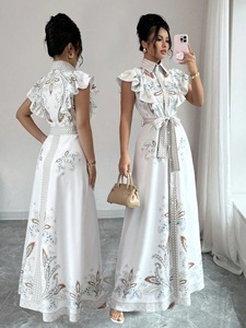 春秋季新款宫廷风复古印花长袖收腰大摆长裙时尚单排扣立领连衣裙