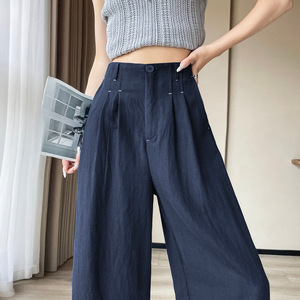 藏青色天丝亚麻裤子女夏季薄款2025新款棉麻阔腿裤直筒休闲山本裤