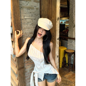 【ビンゴ】+シャヘ25春ウッドビーズホルターネックデコンストラクトシャツオフショルダーベストトップス女性用