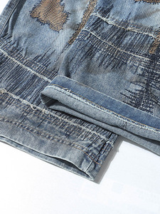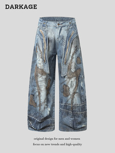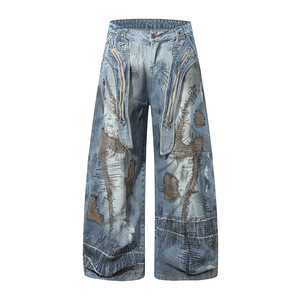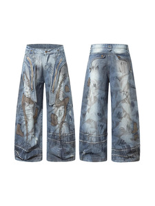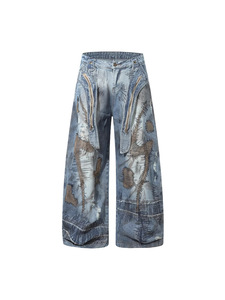 クロスボーダーアメリカンストリートヘビーデューティーランダムステッチ刺繍ステインジーンズ男性と女性の荒野スタイルルーズワイドレッグシミターパンツ