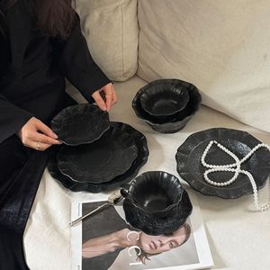 レトロフレンチマットブラックレリーフレースセラミックディナープレートボウルカップハイフットプレート中古重工業シリーズ