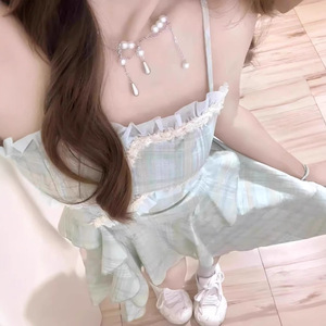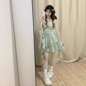十三行品质-少女风甜美绿色无袖吊带裙收腰显瘦不规则中长裙