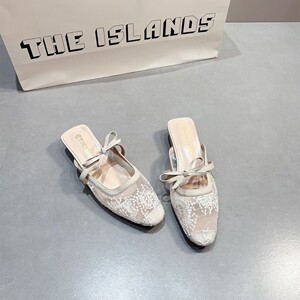 女性用フレンチトゥサンダル、レースメッシュシューズ、バタフライ中空ハーフスリッパ、女性用夏用多用途太ヒールサンダル