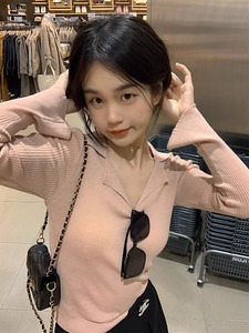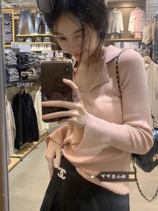 粉色长袖针织衫夏季设计感修身内搭打底衫女装polo领毛衣ins上衣