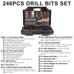 246点セットのドリルビットセット、木工用フラットドリル、スパイラルドリル、セメントドリル、穴あけ工具
