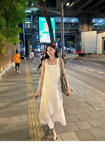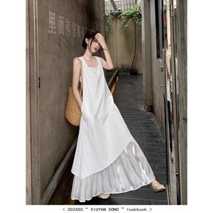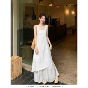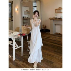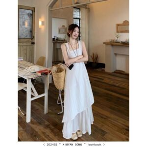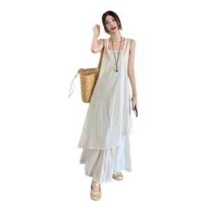 白と青のノースリーブワンピース、女性用、夏、フレンチスタイル、エレガント、海辺の休暇用ロングドレス