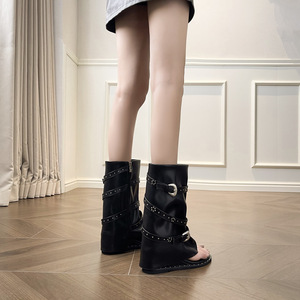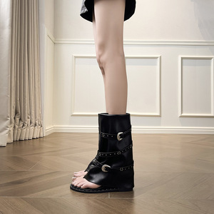 在庫ありホットガールパンツブーツショートブーツ女性のための 2025 夏の新しいレトロなリベットサンダルクリップつま先インナー高さサンダル