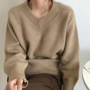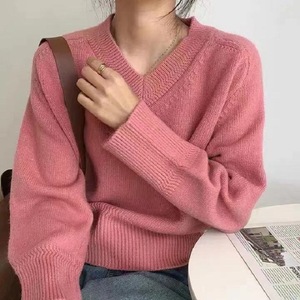 韓国東大門無地ソフトワックス状 V ネックセーター女性の秋と冬の長袖アウタープルオーバートップボトミングセーター