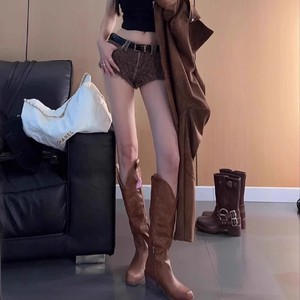 ウエスタンカウボーイブーツレディースハイライダーブーツポインテッドトゥ2025新ブラウンレトロ刺繍太ヒールブーツロングブーツ