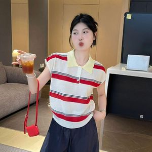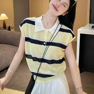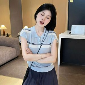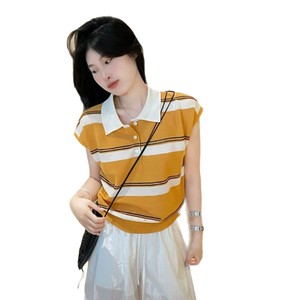 韩系条纹polo领冰丝针织短袖t恤女夏季宽松显瘦别致独特上衣