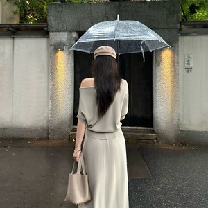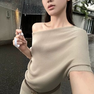 2025 5wer気質レディオフショルダーニット半袖スカートセット気質ファッション2点セットクウェン