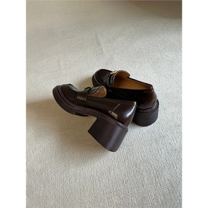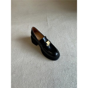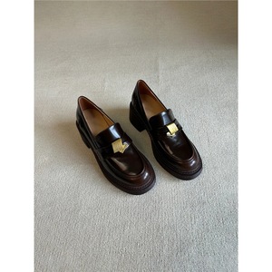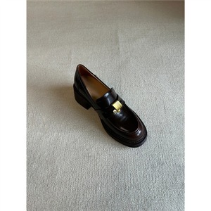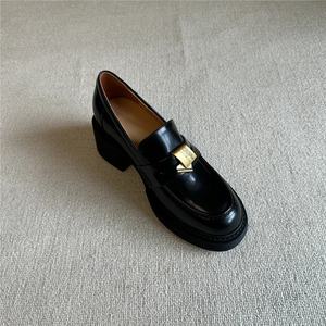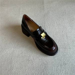 牛皮版~复古粗跟小皮鞋金属扣一脚蹬高跟乐福鞋子通勤深口单鞋女