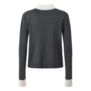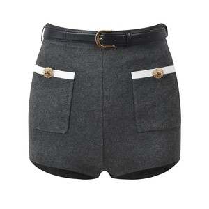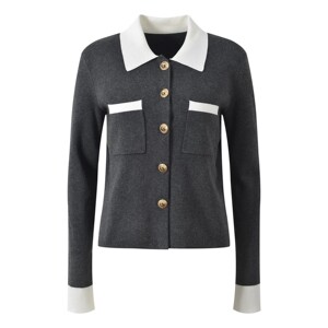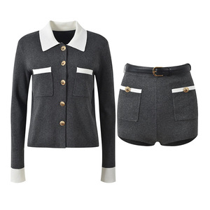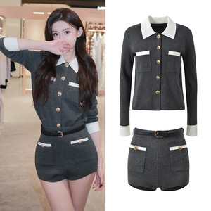 2025秋の新作コントラストカラーステッチラペル長袖ニットカーディガン+ベルト付き黒ハイウエストショーツ