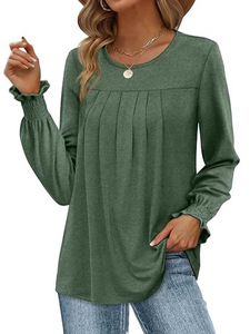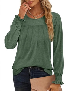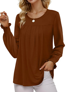 ヨーロッパとアメリカのクロスボーダー 2025 Amazon 大きいサイズの女性の秋と冬の新しいスタイルのラウンドネックパフスリーブ長袖ソリッドカラー Tシャツ女性用