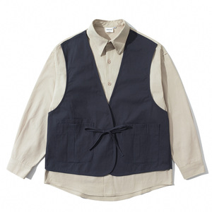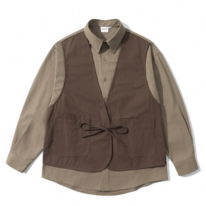 日本のレトロなアミカーキフェイクツーピースベストスプライシングワークシャツ男性と女性のためのルーズコットン長袖シャツトレンディ