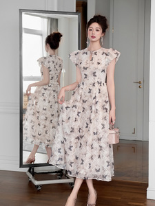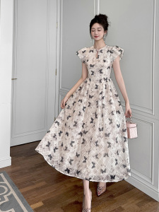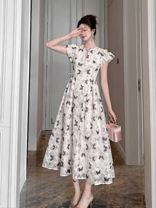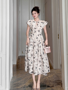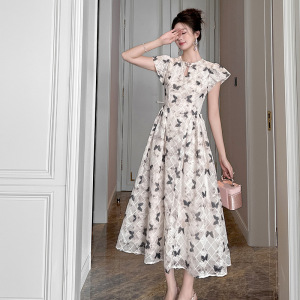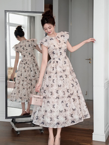 2025 新しい夏の女性の国民風デザインパフスリーブウエスト大きな裾蝶プリントドレス 21741