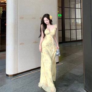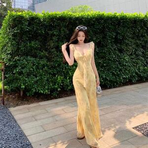 女性用イエロープリントサスペンダードレス、夏のフレンチフリルスカート、ウエストを細くする、妖精のようなロングスカート