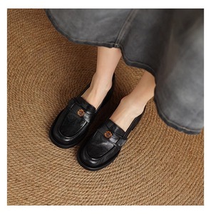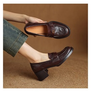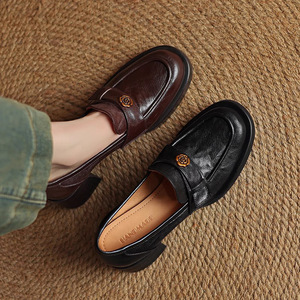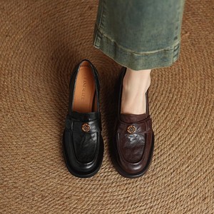 现货~真皮山茶花一脚蹬乐福鞋女复古小皮鞋英伦通勤高跟粗跟单鞋