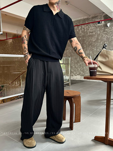 OXFREAK「立体I字プリーツAラインシルエット」ストライプカジュアルパンツメンズ通勤ルーズストレートスーツパンツ