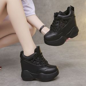 原宿镂空透气12厘米内增高女鞋系带坡跟韩版百搭白色厚底运动鞋潮