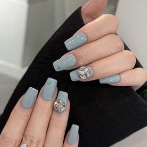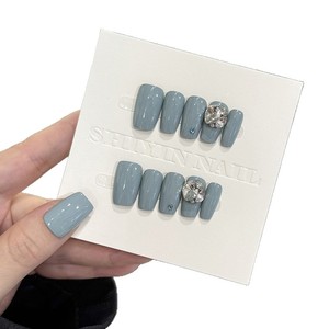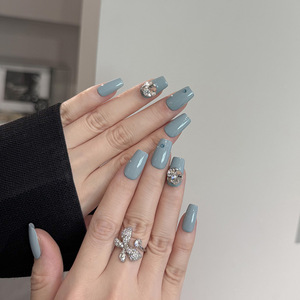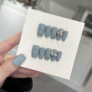 成品美甲喷涂雾霾蓝精品堆钻穿戴甲短款夏日新款显白轻奢小众甲贴