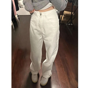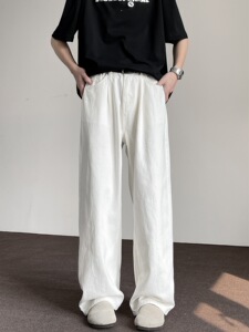 夏の新しいアメリカンハイストリートホワイトジーンズメンズハイエンドルーズストレートワイドレッグフロアレングス多用途ロングパンツ
