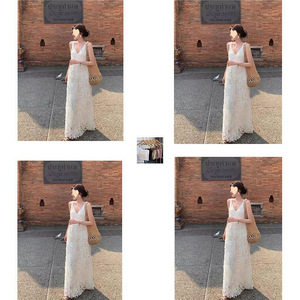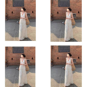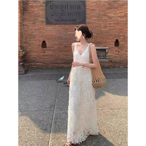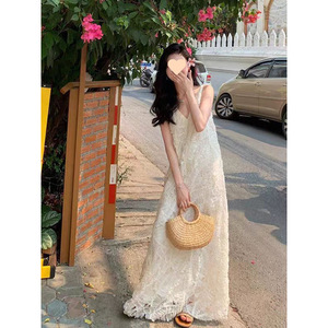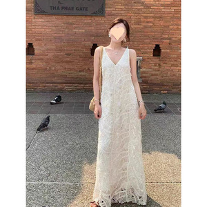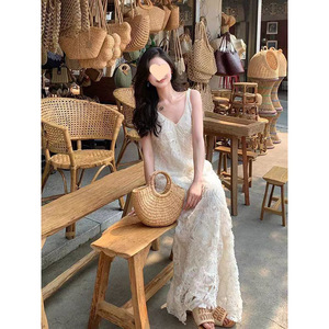 夏日绝美小裙子法式高级感小香风海边度假重工白色v领无袖连衣裙