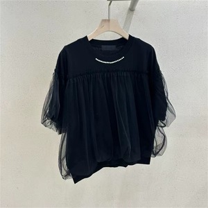 在庫あり 2025 夏の新韓国スタイル袖パッチワークメッシュパッチワークパール Tシャツルーズシックでエレガントなトップ