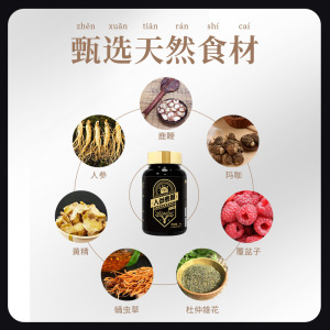マカ(1錠あたり102mg)、シナモン、ヤムイモ、高麗人参(人工栽培)、桑、牡蠣ペプチド、ナマコ、クコ、タデ、鹿鞭粉末(飼育)