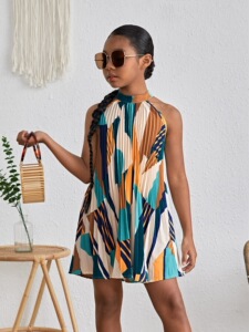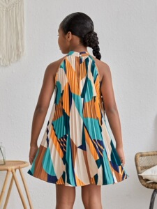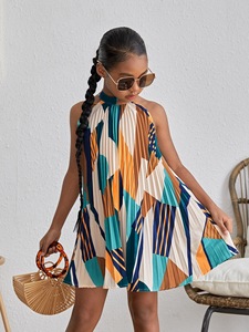 外贸童装地理印刷吊带脖子百褶细节连衣裙