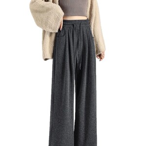 女性用グレーもち米パンツ2025秋新作人気ドレープ感のある小柄な人向けカジュアルストレートナローワイドレッグパンツ