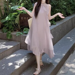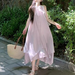 粉紫色挂脖连衣裙