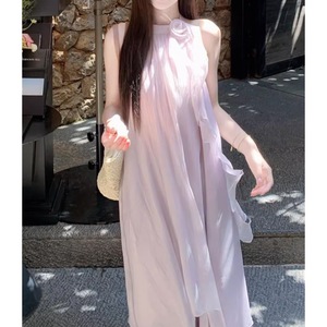 轻紫色挂脖吊带连衣裙女夏多巴胺新疆西北旅游海边度假沙滩长裙子