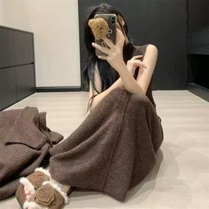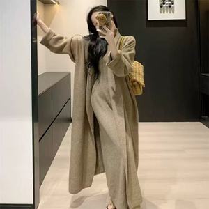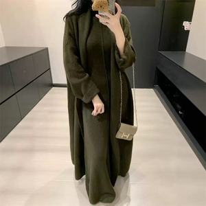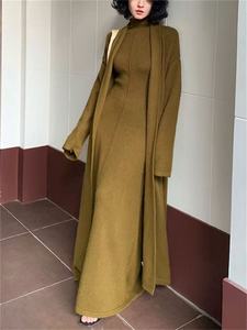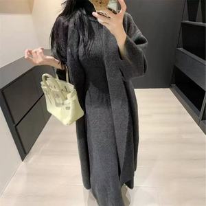 香港スタイルのレトロなロングニットカーディガンハイカラードレスツーピースセット女性のための秋と冬の気質セータースーツ女性のための