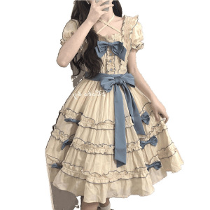 法式洛丽塔公主裙Lolita洋气泡泡袖拼接花边绑定蝴蝶结收腰连衣裙