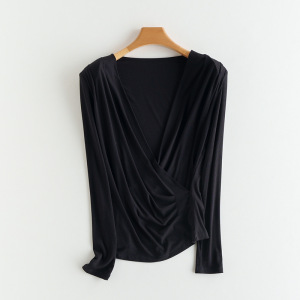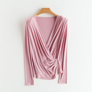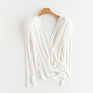 【衡嘉CF】桑蚕丝罗纹长袖T恤女显瘦纯色交叉领简约百搭薄上衣