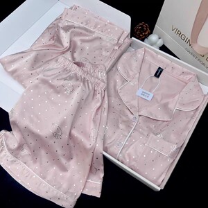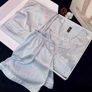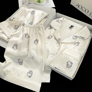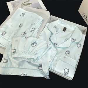 女性用胸パッド付きアイスシルクパジャマ3点セット、甘くてかわいいホットシルバーKT猫半袖アイスシルクホーム服夏薄手スタイル