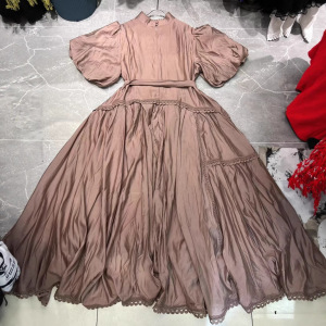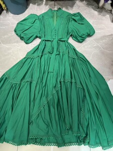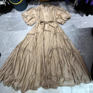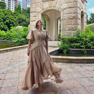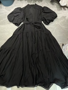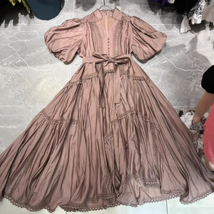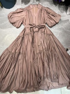 2025春秋新作、ファッショナブルで軽い高級バケーションビーチVネックパフスリーブパッチワークレース大振りドレス