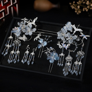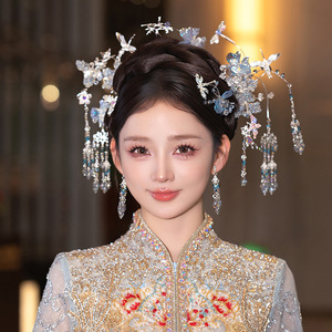 蓝色秀禾头饰新娘古典气质出门晨袍影楼跟妆秀禾服流苏发簪配饰品