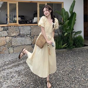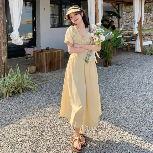 法式黄色泡泡袖甜美减龄v领褶皱连衣裙夏季新款气质高腰显瘦长裙
