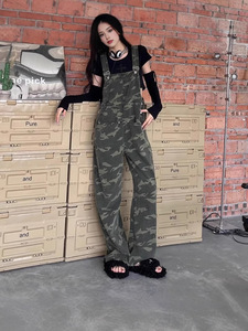 トレンディなブランド迷彩デニムオーバーオール女性のための夏薄いアメリカンレトロハイウエストスリムワンピースロングパンツ