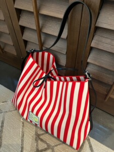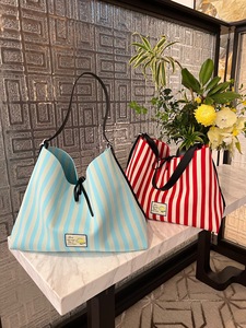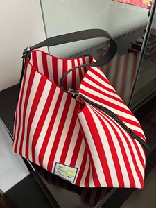 韓国の赤と白のピンストライプのキャンバストートバッグ、コントラストカラーのステッチ、大容量のシングルショルダークロスボディバッグ、カジュアルでレイジースタイル