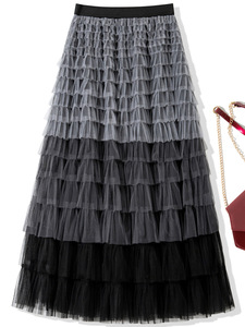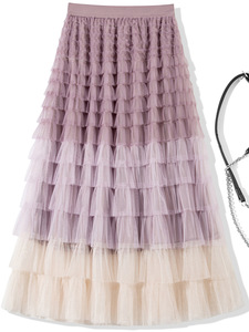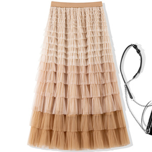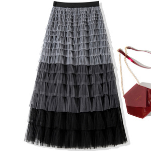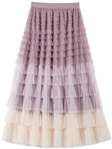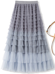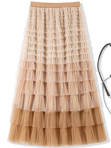 B2106 2025 春夏新作ウエストゴムグラデーションカラーレイヤードケーキスカートプリンセスメッシュスカートロングスカート